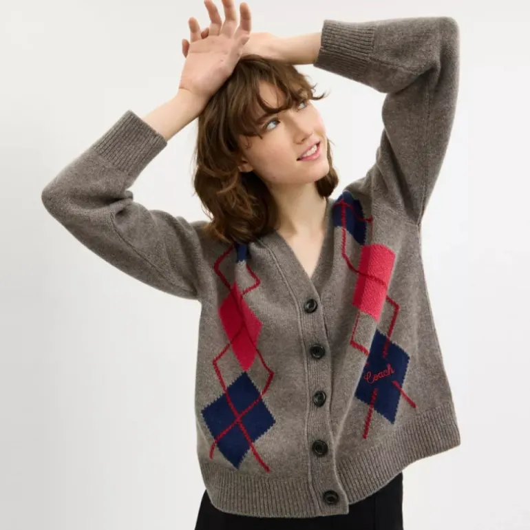 Ein kuscheliges Modell, neuinterpretiert mit einem übergroßen Argyle-Muster auf der Vorderseite. Der Cardigan mit Classic-Fit und V-Ausschnitt ist aus warmer Wolle gestrickt und verfügt über unsere Namensstickerei am Saum, die ihm einen dezenten Hauch von Tradition verleiht.