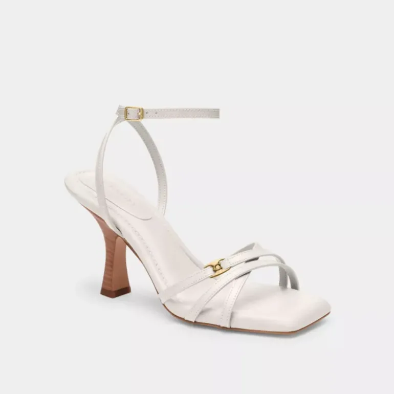 Our polished Heritage C Plaque adds an iconic touch to this strappy smooth leather Kelsey sandal. Finished with an ankle-wrap buckle closure, the square-toe warm weather style features a leg-lengthening sculpted heel and a padded footbed for day-to-night comfort.