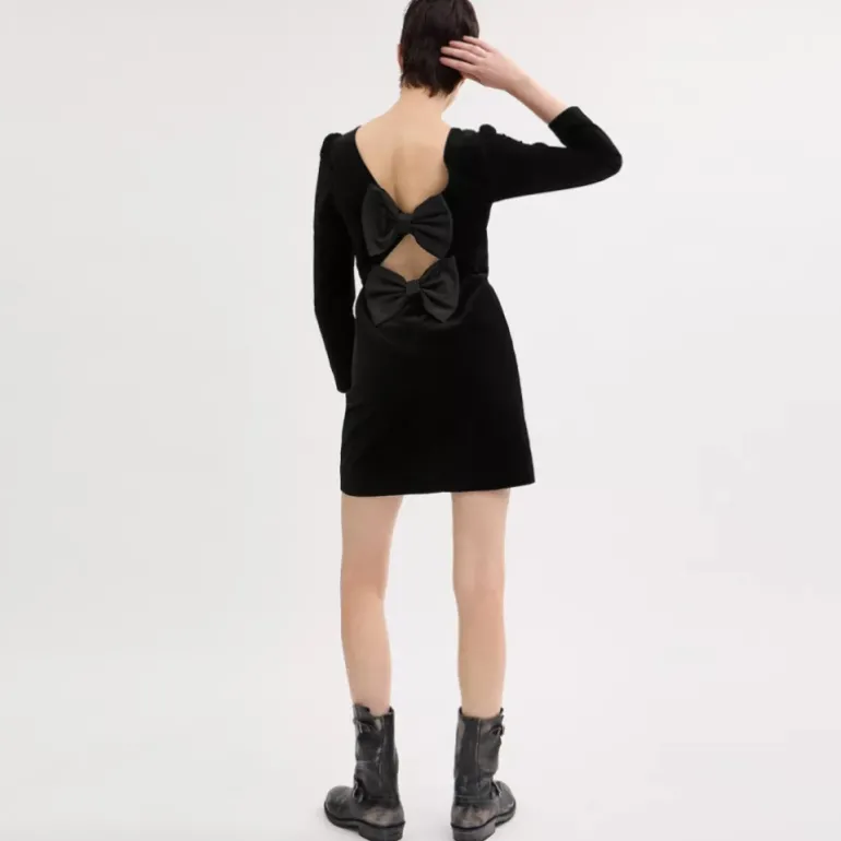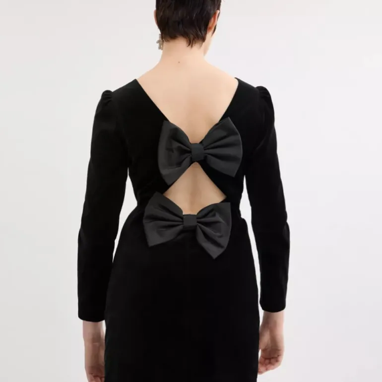 A party-ready style, this V-neck mini dress is crafted of ulta-soft velvet with a silky smooth feel. Featuring long puff sleeves for a bit of volume, it’s finished with a deep V-back, a diamond cut-out and two large bows for a playful touch.