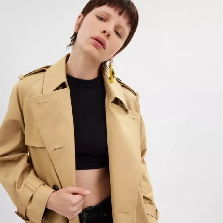 Dieser Trench aus einer leichten Baumwollmischung ist die moderne Interpretation einer zeitlosen Silhouette und sorgt mit seiner lockeren Passform für entspanntes Tragen. Das zweireihige Modell zeigt unsere Heritage-C-Plakette an den Schulterklappen sowie Lederschnallen für einen kultigen Hauch von Coach. Eine Sturmklappe, ein verstellbarer Taillengürtel, Manschetten mit Riemen und ein Schlitz hinten für mehr Bewegungsfreiheit runden die Silhouette ab.