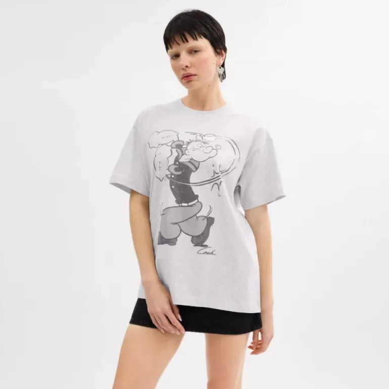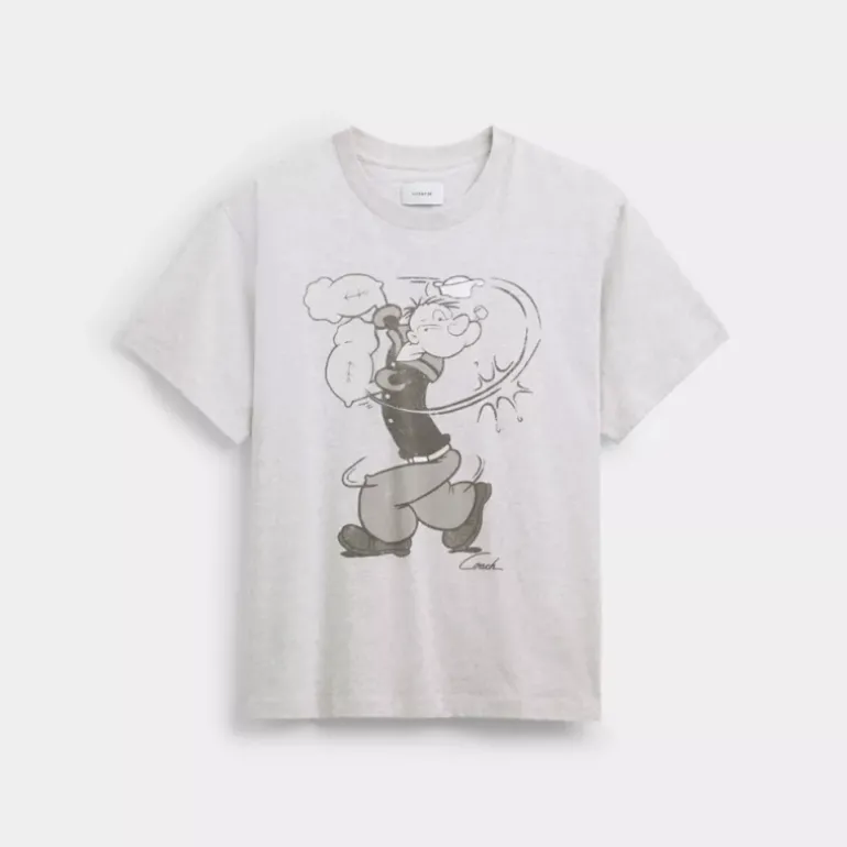 Coach feiert den beliebten Cartoon-Matrosen Popeye mit einer Sonderkollektion, die frühe Schwarz-Weiß-Illustrationen des spinatliebenden Seemanns mit dem Herz aus Gold zeigt. Der Held, der immer für eine gute Sache kämpft, posiert auf diesem klassisch geschnittenen, weichen Baumwoll-T-Shirt.