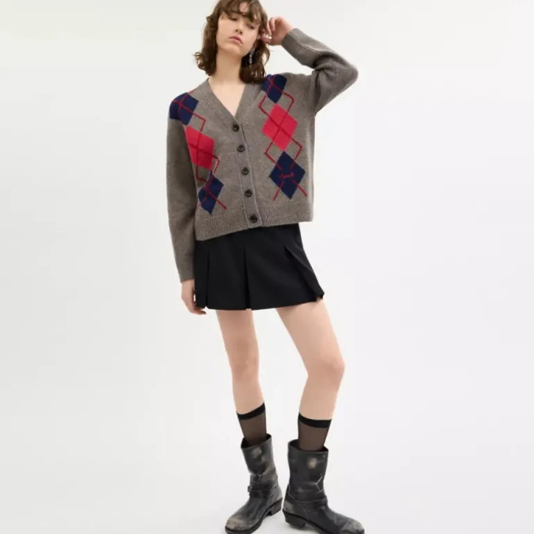 Ein kuscheliges Modell, neuinterpretiert mit einem übergroßen Argyle-Muster auf der Vorderseite. Der Cardigan mit Classic-Fit und V-Ausschnitt ist aus warmer Wolle gestrickt und verfügt über unsere Namensstickerei am Saum, die ihm einen dezenten Hauch von Tradition verleiht.