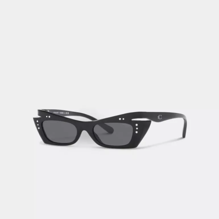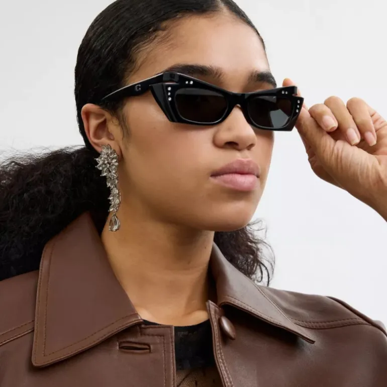Diese auffällige Sonnenbrille ist ein retro-futuristischer Twist einer kultigen Cat-Eye-Silhouette. Sie verfügt über spitze Winkel und funkelnde Kristallakzente, während unsere Signature am Bügel für einen Hauch von Tradition sorgt.
