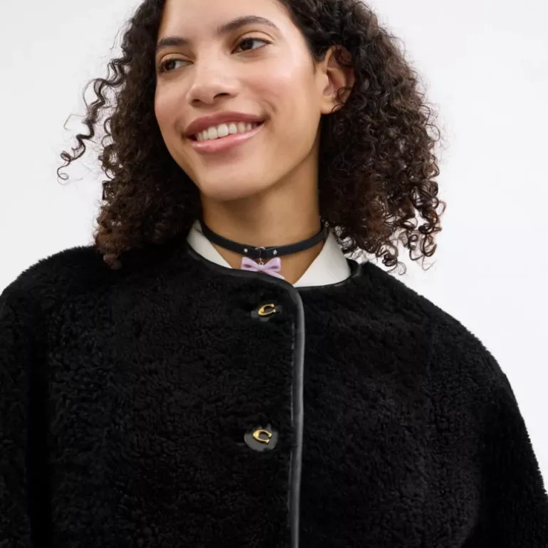 Dieser kragenlose Mantel aus superweichem Lammfell ist die perfekte Mischung aus gemütlich und schick. Das locker geschnittene Design verfügt über große aufgesetzte Taschen und unsere Signature-Emailleknöpfe.