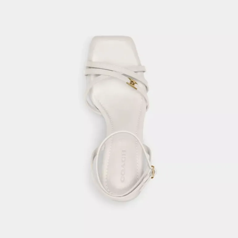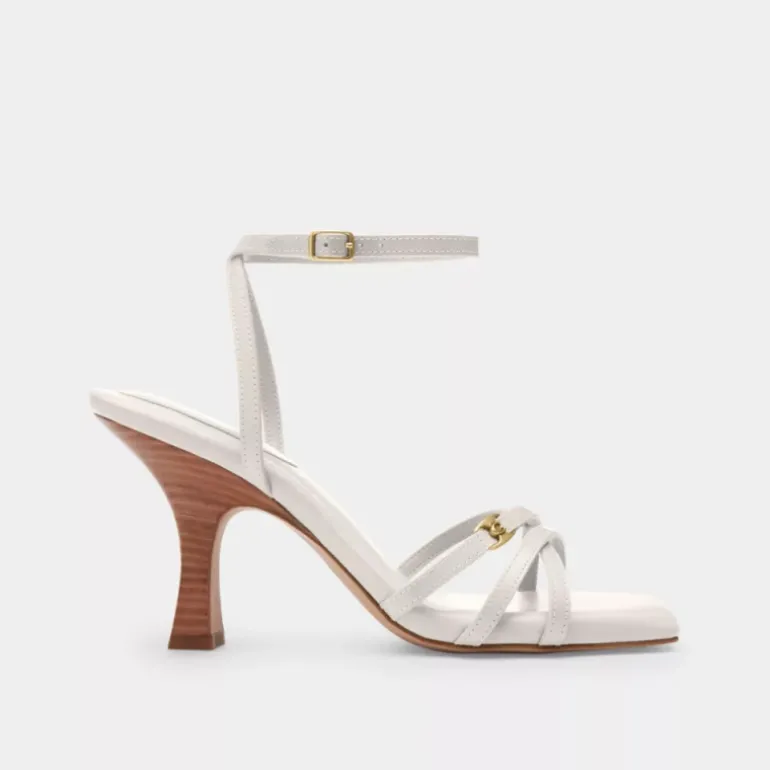 Our polished Heritage C Plaque adds an iconic touch to this strappy smooth leather Kelsey sandal. Finished with an ankle-wrap buckle closure, the square-toe warm weather style features a leg-lengthening sculpted heel and a padded footbed for day-to-night comfort.