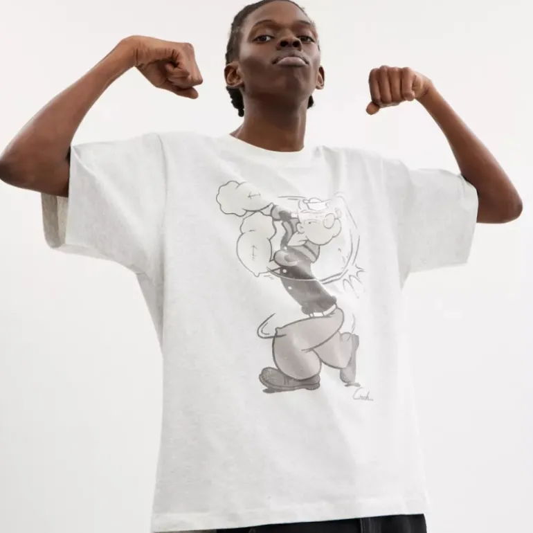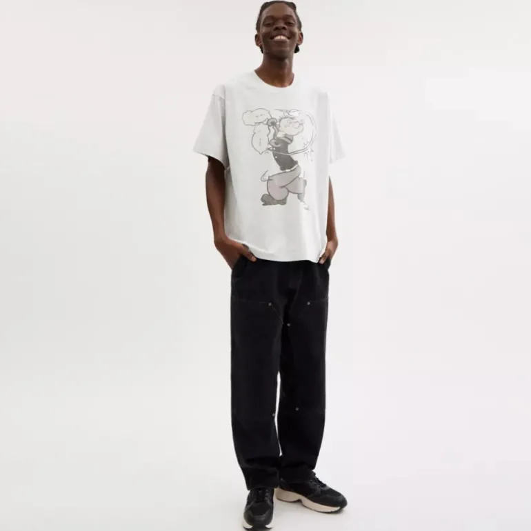 Coach feiert den beliebten Cartoon-Matrosen Popeye mit einer Sonderkollektion, die frühe Schwarz-Weiß-Illustrationen des spinatliebenden Seemanns mit dem Herz aus Gold zeigt. Der Held, der immer für eine gute Sache kämpft, posiert auf diesem klassisch geschnittenen, weichen Baumwoll-T-Shirt.